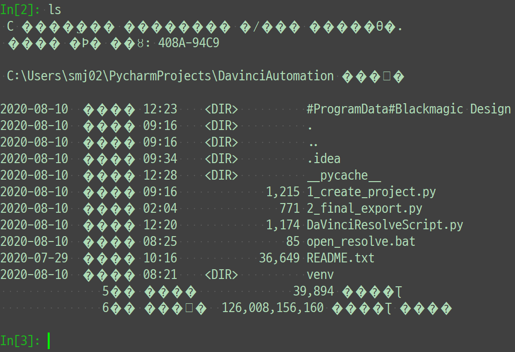 문제점은 파이썬 콘솔에서 터미널(커맨드프롬프트) 명령어를 불러올 때에만 깨진다는 것인데,
