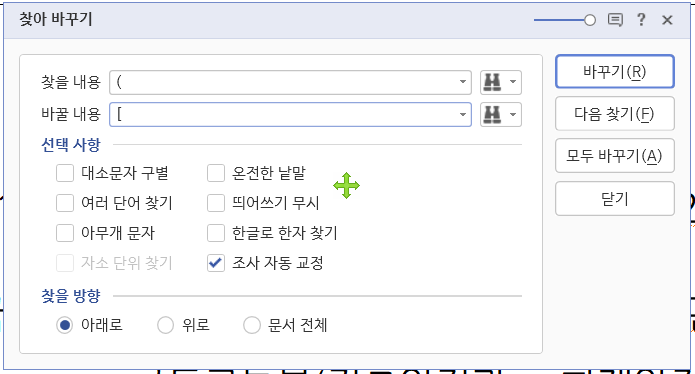 1. 기본적인 "찾아바꾸기" : 조항 제목 뿐 아니라 본문의 괄호도 모두 대괄호로 바뀌기 때문에 사용불가.
