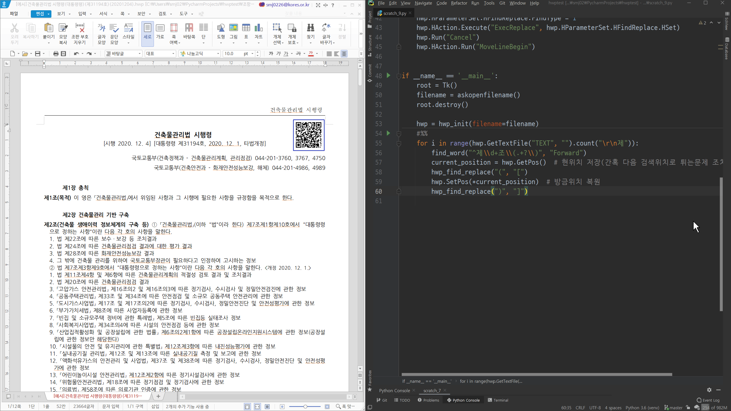이제 파이썬으로 한/글을 열어놓고, hwp_find_replace("(", "[") 라고 실행하면 찾아바꾸기가 한 번 실행되는 거죠.
